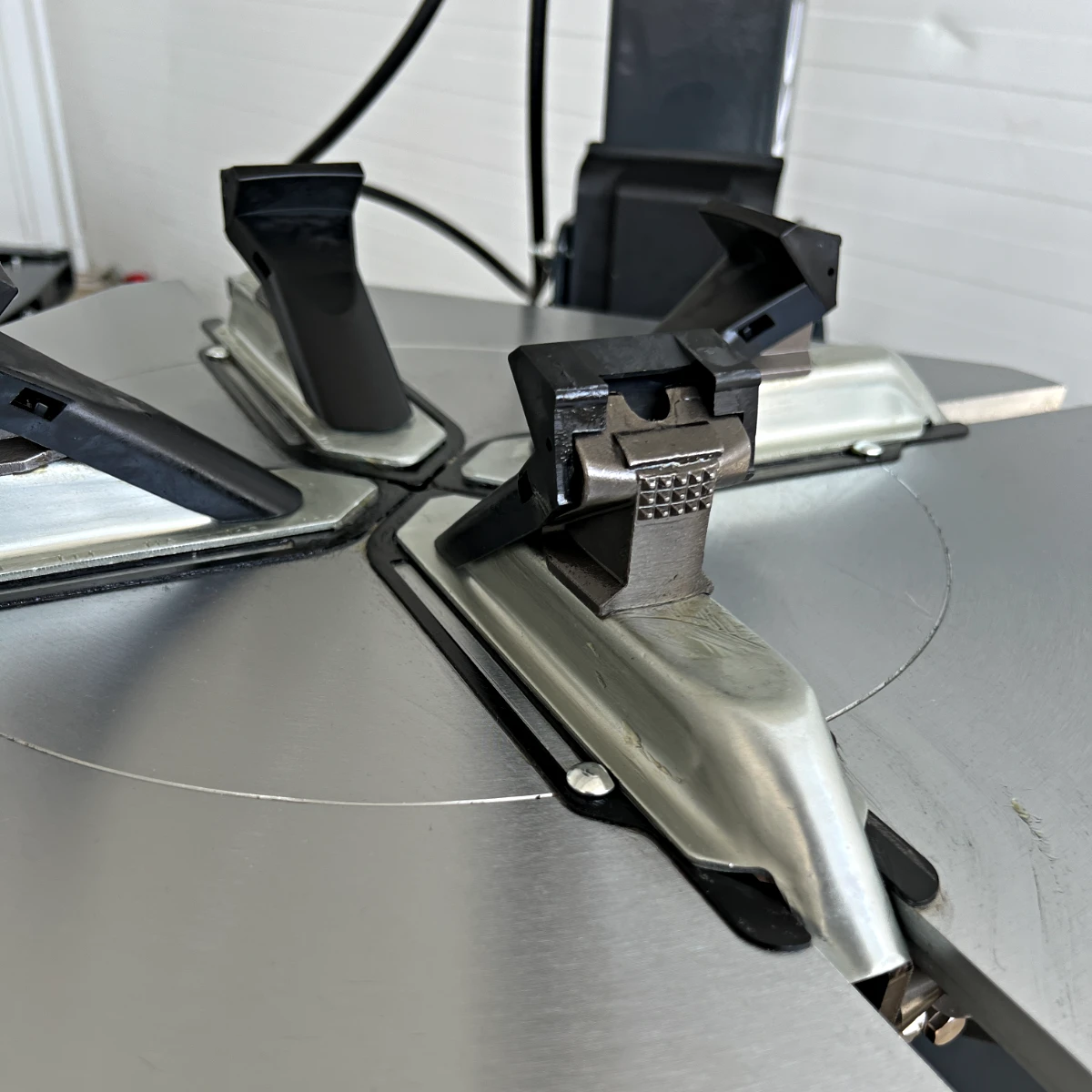 • Управление станком осуществляется с помощью педалей. Специальная скоба-ограничитель позволяет оператору легко находить педали отжима и вращения стола.